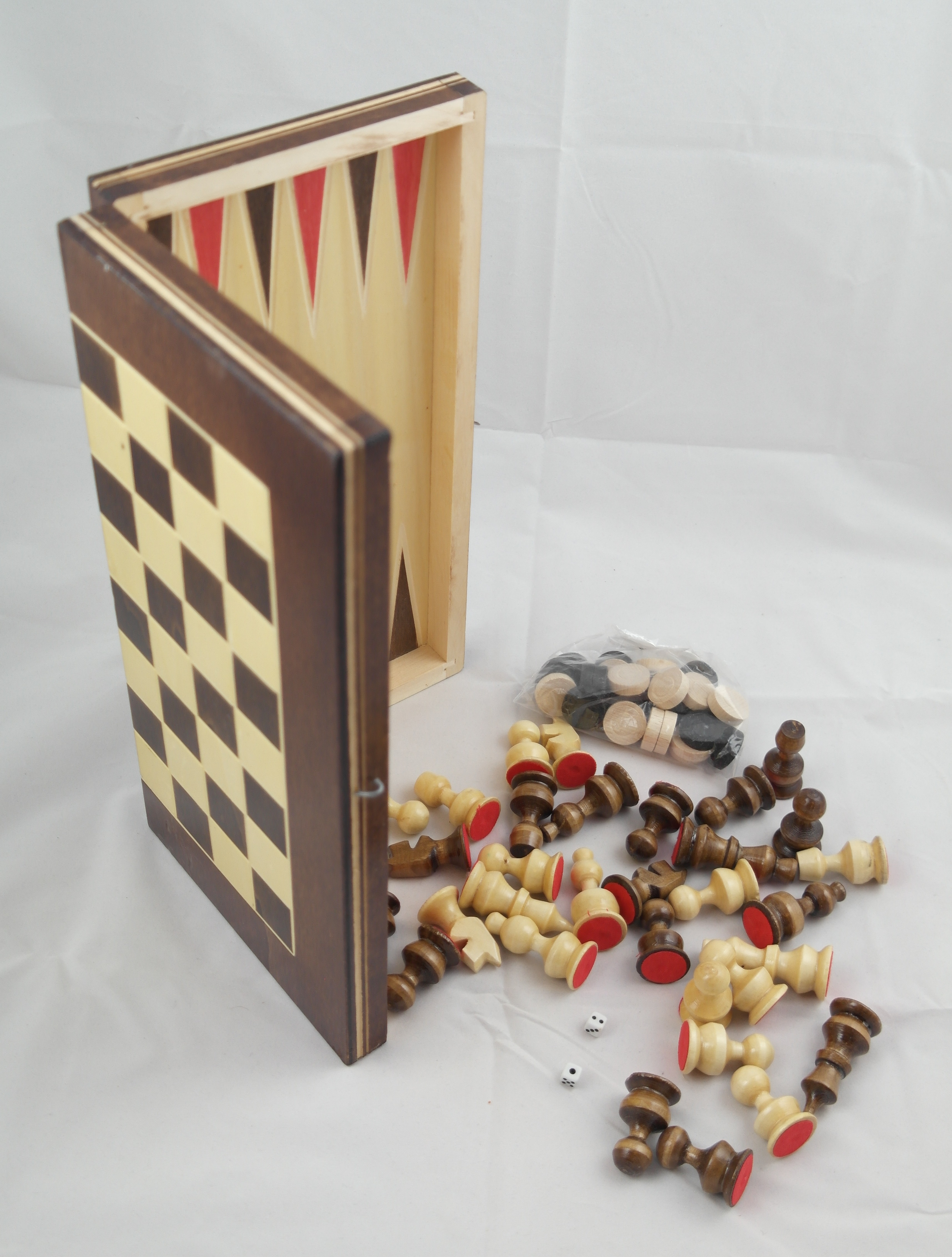 inkl. 32 Spielfiguren für Schach und 30 Spielsteine für Backgammon, inkl. 2 Würfel, inkl. Holzbox (Spielbrett)